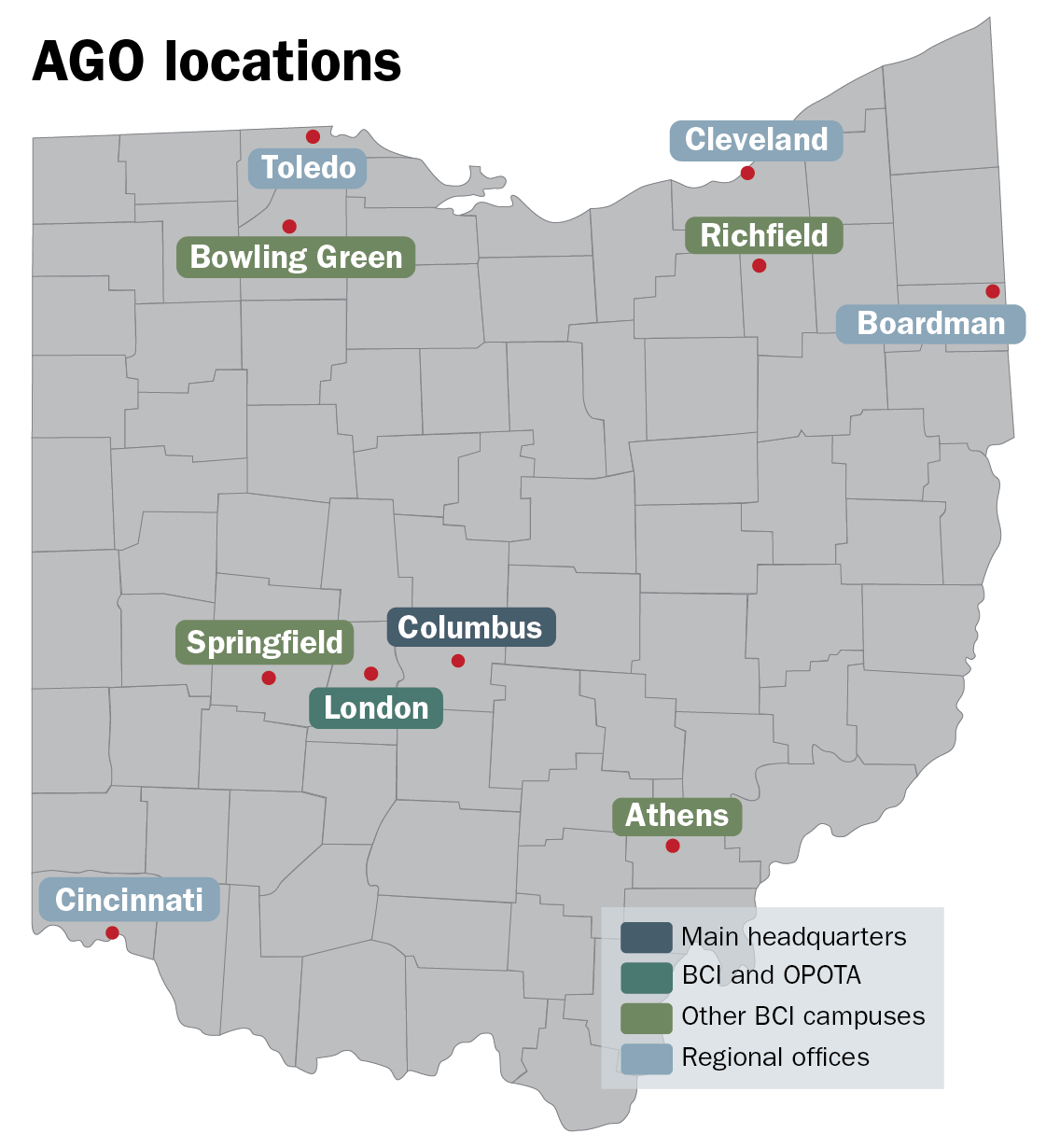 With roughly 1,500 employees based at two primary locations in central Ohio and eight other sites throughout the state, the AGO serves and protects Ohioans in myriad ways. Each year, the office staff interacts with tens of thousands of fellow Ohio residents.