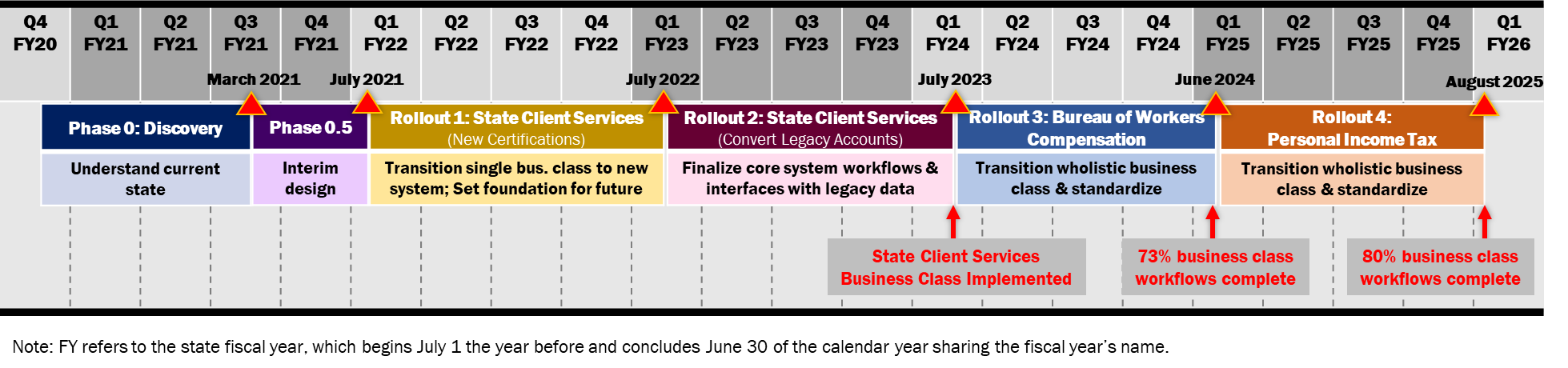 The current implementation plan rolls out the new system by business class, a designation already used by the AGO’s Collections Enforcement Section. There are 11 business classes, listed here in alphabetical order: