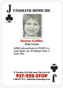 Darlene Griffitts' body was found on 04/12/2001 in a small stream just off Ballinger Road in Union, OH. If you have any information about this case, please contact Miami Valley Crime Stoppers at 937-222-STOP, 1-800-637-5375 or miamivalleycrimestoppers.com.