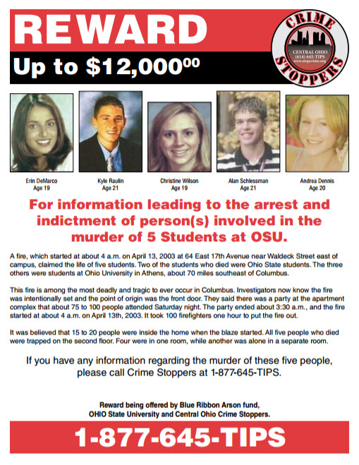 On 04/13/2003 at approximately 4 a.m., 20yr old Andrea Dennis was killed in a house fire at 64 East 17th Avenue near Waldeck Avenue, east of The Ohio State University campus. This house fire claimed the lives of five students, Erin DeMarco, Kyle Raulin, Christine Wilson, Alan Schlessman and Andrea Dennis. Two of the students who died were Ohio State students, and three others were students at Ohio University in Athens. Investigators now know the fire was intentionally set and the point of origin was the front door. They said there was a party at the apartment complex that about 75 to 100 people attended Saturday night. The party ended about 3:30 a.m., and the fire started at about 4 a.m. It took 100 firefighters one hour to put the fire out. It was believed that 15 to 20 people were inside the home when the blaze started. All five people who died were trapped on the second floor. Four were in one room, while another was alone in a separate room.