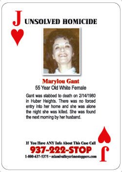 Marylou Gant was stabbed to death on 02/14/1980 in Huber Heights, OH. There was no forced entry into her home and she was alone the night she was killed. She was found the next morning by her husband. If you have any information about this case, please contact Miami Valley Crime Stoppersat 937-222-STOP, 1-800-637-5375 or miamivalleycrimestoppers.com.