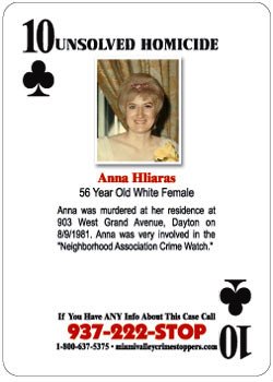 Anna Hliaras was murdered at her residence at 903 West Grand Avenue, Dayton, OH on 08/09/1981. Anna was very involved in the "Neighborhood Association Crime Watch". If you have any information about this case, please contact Miami Valley Crime Stoppers at 937-222-STOP, 1-800-637-5375 or miamivalleycrimestoppers.com.