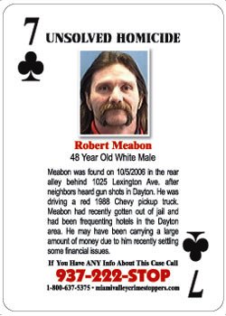 Robert Meabon was found on 10/05/2006 in the rear alley behind 1025 Lexington Avenue after neighbors heard gun shots in Dayton. He was driving a red 1988 Chevy pickup truck. Meabon had recently gotten out of jail and had been frequenting hotels in the Dayton area. He may have been carrying a large amount of money due to him recently settling some financial issues. If you have any information about this case, please contact Miami Valley Crime Stoppers at 937-222-STOP, 1-800-637-5375 or miamivalleycrimestoppers.com.