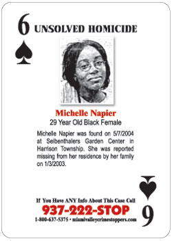 On 10/04/2003, twenty-nine year old Michelle Napier was reported missing from her residence located at 1829 Palisades in Harrison Township. On 05/07/2004, Napier was found in a wooded area near 3001 Catalpa road in Harrison Township.
