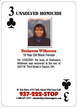 On 10/22/2001, the body of Deshawna Wilkerson was recovered at the rear of 3521 West Third Street in Dayton, OH. If you have any information about this case, please contact Miami Valley Crime Stoppers at 937-222-STOP, 1-800-637-5375 or miamivalleycrimestoppers.com.