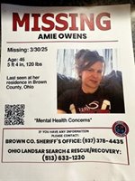 Amie was last heard from on March 30, 2025 in Goshen, Ohio. Family and law enforcement are concerned for her safety. If you see Amie, call 911 or the Brown County Sheriff's Office.