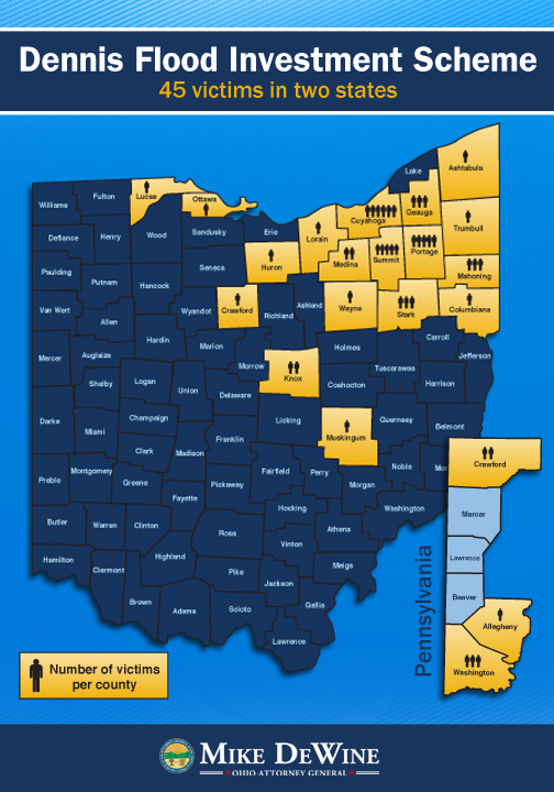 Dennis Flood, 64, of Brunswick, pleaded guilty in Cuyahoga County Common Pleas Court last month to felony charges of engaging in a pattern of corrupt activity and aggravated theft. He was sentenced today by Judge Hollie Gallagher to serve eight years in prison and pay a total of $1,153,163.77 in restitution to the victims who lost money in connection with the scheme.