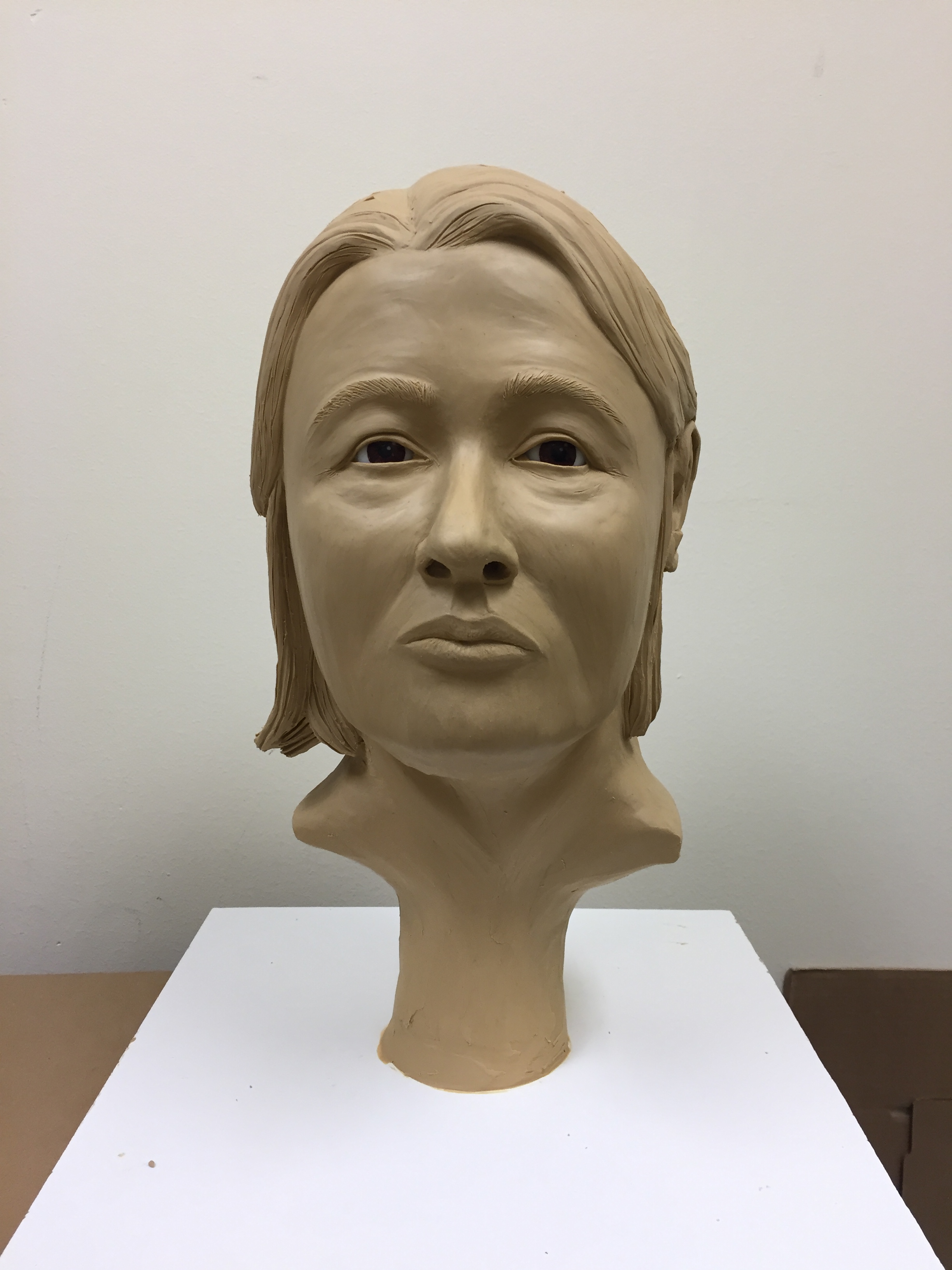 To create this forensic facial reconstruction model, BCI partnered with The Ohio State University, which used a 3D printer to create a plastic model of the woman's skull. One of BCI's forensic artists then built the clay model on top of the printed skull. The process to create the facial features, which generally takes between 50-60 hours to complete, begins with the creation of muscles and tissue and then uses scientific guidelines to determine the thickness of the tissue in areas such as the chin, brow, nasal bridge, and cheeks. Because it is impossible in this case to know the woman's hairstyle, the forensic artist created an average hairstyle for the model.