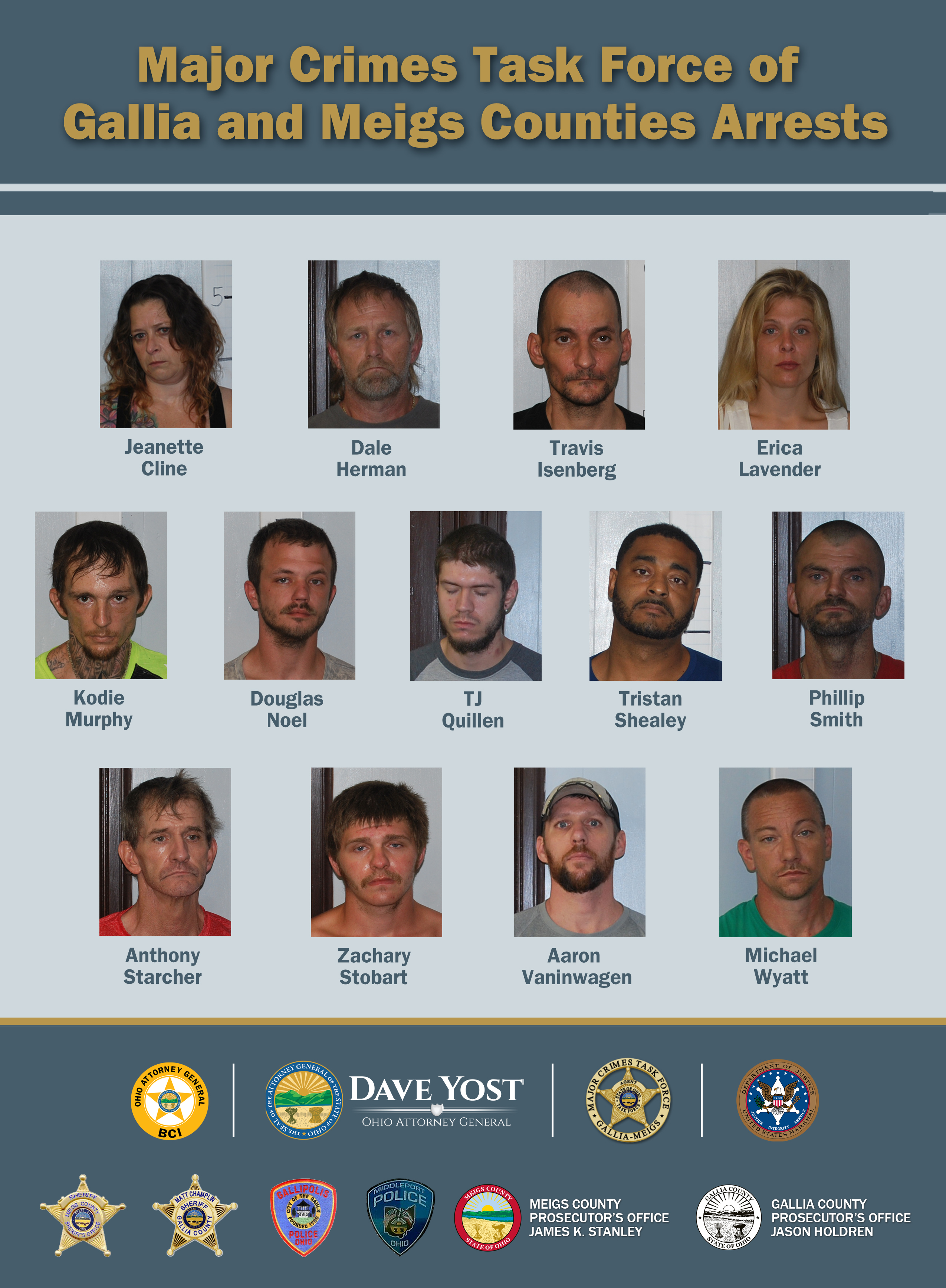 Twelve suspects were taken into custody Thursday as part of an investigation by the Major Crime Task Force of Gallia and Meigs Counties, which is part of Attorney General Yost’s Organized Crime Investigations Commission (OOCIC). The task force includes the Meigs and Gallia county sheriff’s offices and prosecutor’s offices, the Gallipolis Police Department, the Middleport Police Department and the Ohio Attorney General’s Bureau of Criminal Investigations. The U.S. Marshal’s Service assisted with the arrests.