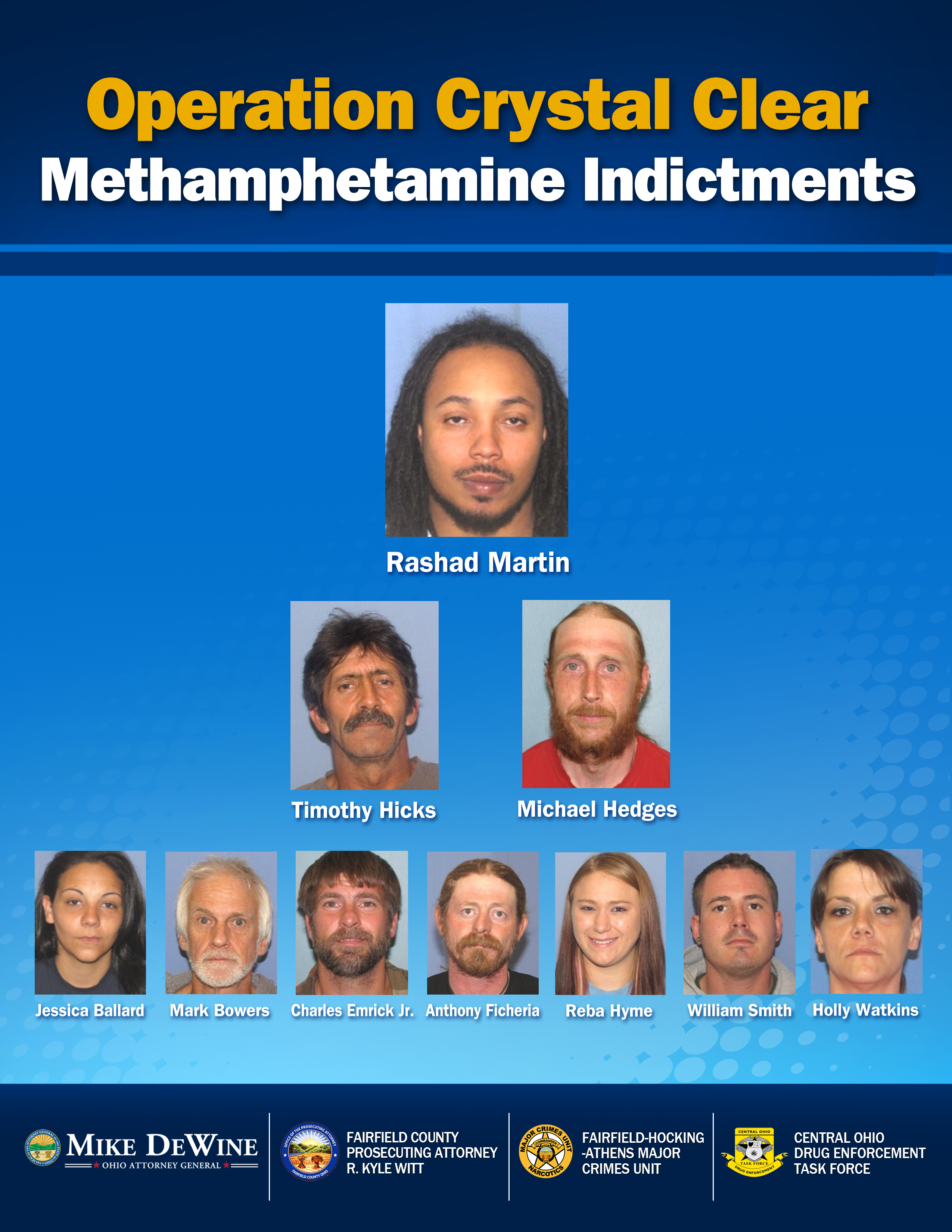 (LANCASTER, Ohio)— Ohio Attorney General Mike DeWine, Fairfield County Prosecuting Attorney R. Kyle Witt, and members of the Fairfield-Hocking-Athens Major Crimes Unit and Central Ohio Drug Enforcement Task Force announced today the takedown of a major methamphetamine trafficking organization that is believed to have been among the largest suppliers of methamphetamine in Fairfield County.