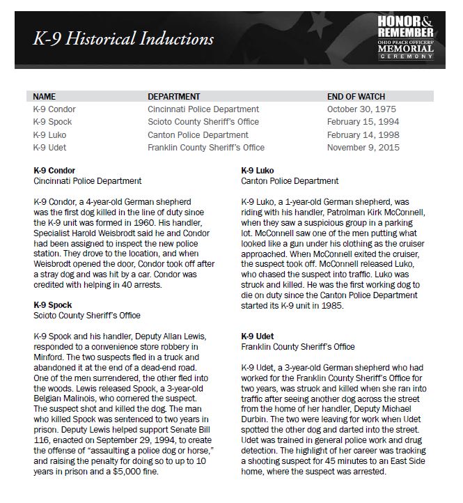 Visit the Ohio Attorney General's website to read more about K-9 Jethro and the historical K-9 inductions.