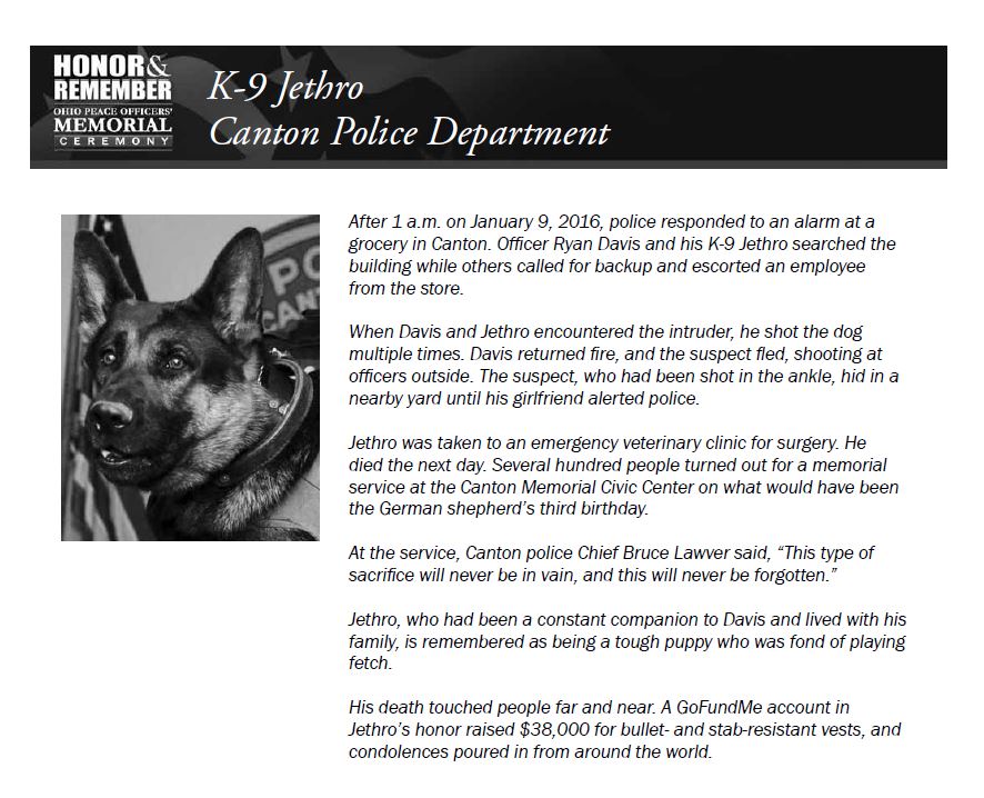 In addition, five K-9s killed while serving law enforcement were recognized as part of the Ohio Peace Officers' Memorial Ceremony. K-9 Jethro of the Canton Police Department died on January 10, 2016, after being shot multiple times by a suspect after the K-9 officer and his handler responded to an alarm at a grocery store and encountered the intruder. K-9 Jethro's name, along with the following K-9 historical inductions, have been added to a plaque displayed at the academy: