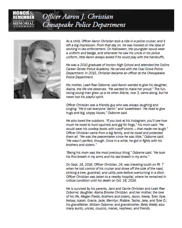 On Sept. 18, 2016, Officer Christian, 24, was traveling south on Rt. 7 when he lost control of his cruiser and crashed. He was taken to a nearby hospital, where he remained in critical condition until his death on Oct. 18, 2016. He was a 2010 graduate of Ironton High School and attended the Collins Career Center Police Academy. He served with the Coal Grove Police Department, and in 2015, Officer Christian became an officer at the Chesapeake Police Department. The fun-loving young man grew up a lot when his daughter, now 3, came along, but he never lost his playful spirit. Click here to read more about Officer Christian.