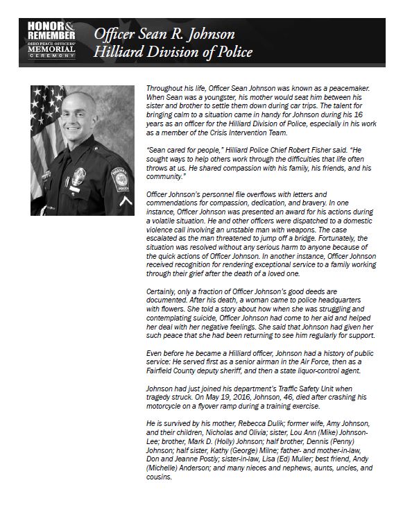 On May 19, 2016, Officer Johnson, 46, died after crashing his motorcycle on a flyover ramp during a training exercise. Officer Johnson had just joined his department's Traffic Safety Unit prior to the accident. Throughout his life, Officer Johnson was known as a peacemaker. The talent for bringing calm to a situation came in handy for Officer Johnson during his 16 years as an officer for the Hilliard Division of Police, especially in his work as a member of the Crisis Intervention Team. Even before he became a Hilliard officer, Officer Johnson had a history of public service: He served first as a senior airman in the Air Force, then as a Fairfield County deputy sheriff, and then as a state liquor-control agent. Click here to read more about Officer Johnson.