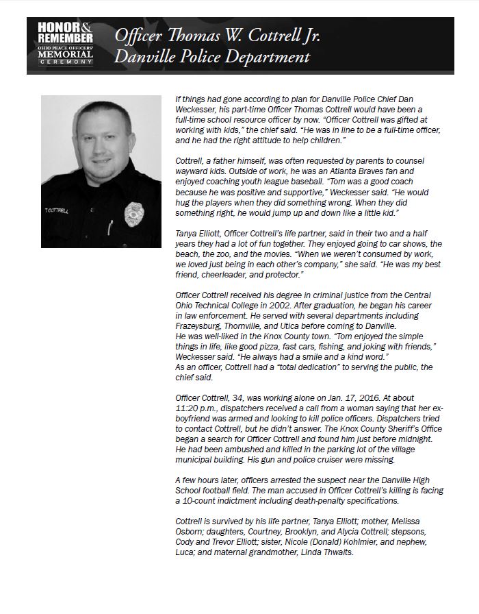 On Jan. 17, 2016, Officer Cottrell, 34, was ambushed and killed in the parking lot of the village municipal building. Officer Cottrell received his degree in criminal justice from the Central Ohio Technical College in 2002. After graduation, he began his career in law enforcement. He served with several departments including Frazeysburg, Thornville, and Utica before coming to Danville. Officer Cottrell, a father himself, was often requested by parents to counsel wayward kids. Outside of work, he was an Atlanta Braves fan and enjoyed coaching youth league baseball. Click here to read more about Officer Cottrell.