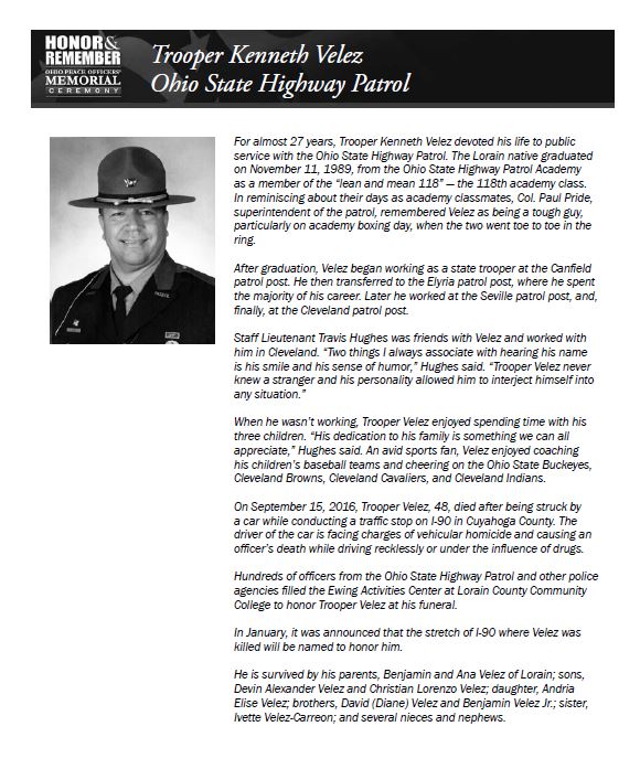 On September 15, 2016, Trooper Velez, 48, died after being struck by a car while conducting a traffic stop on I-90 in Cuyahoga County. For almost 27 years, Trooper Velez devoted his life to public service with the Ohio State Highway Patrol. The Lorain native graduated in 1989 from the Ohio State Highway Patrol Academy as a member of the "lean and mean 118" - the 118th academy class. After graduation, Velez began working as a state trooper at the Canfield post, and he then transferred to the Elyria patrol post, where he spent the majority of his career. Later he worked at the Seville patrol post, and, finally, at the Cleveland patrol post. When he wasn't working, Trooper Velez enjoyed spending time with his three children. Click here to read more about Trooper Velez.
