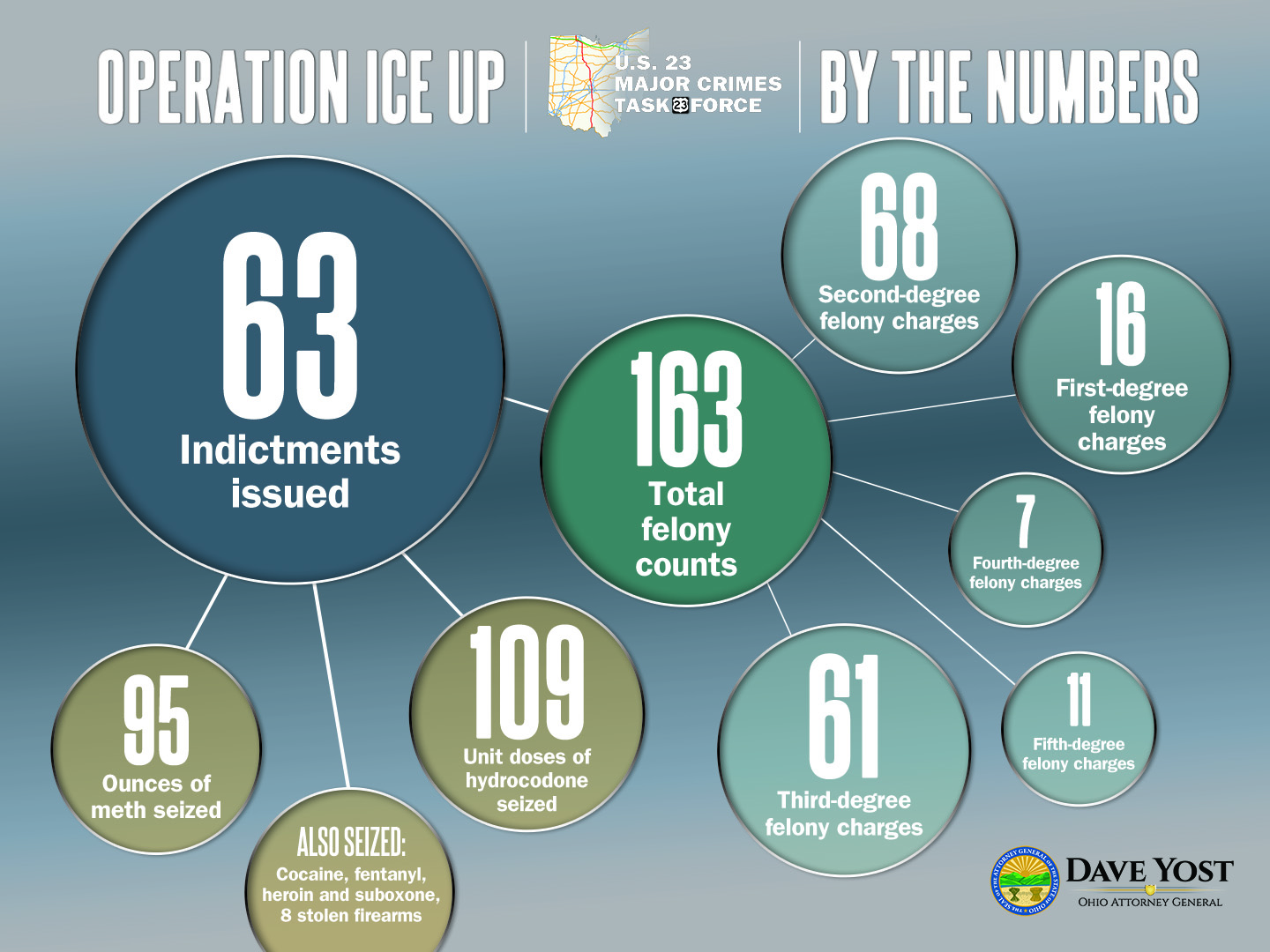 (CIRCLEVILLE, Ohio) — Ohio Attorney General Dave Yost today announced the success of a major undercover drug task force operation that took down 59 individuals and recovered large amounts of drugs and stolen guns.