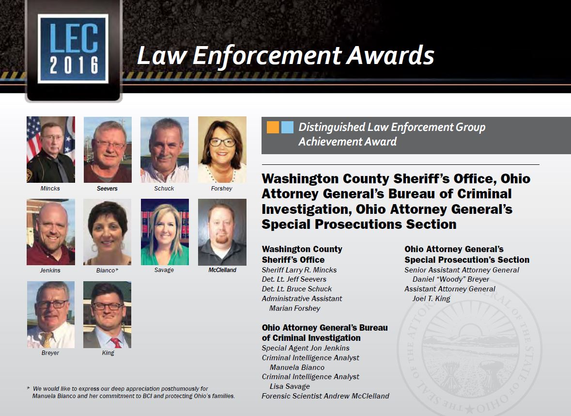(COLUMBUS, Ohio) -- Ohio Attorney General Mike DeWine today honored several law enforcement professionals with Distinguished Law Enforcement Achievement awards during the Ohio Attorney General's Law Enforcement Conference in Columbus.