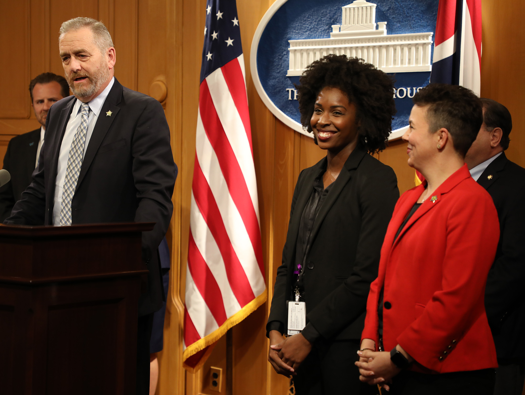 Above, from left: Attorney General Dave Yost and the Human Trafficking Initiative's Jomel Aird, director of victim services, and Jennifer Rausch, legal director of the initiative