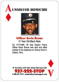 On 11/01/1999, off duty Dayton Police Officer Kevin Brame was shot and killed outside of his residence on Cherry Drive in Dayton, OH. If you have any information about this case, please contact Miami Valley Crime Stoppers at 937-222-STOP, 1-800-637-5375 or miamivalleycrimestoppers.com.