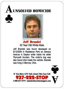 Jeff Brandel was found deceased on 06/12/2005 in Residence Park on Geneva Avenue in Dayton, OH while inside his white Plymouth Acclaim. The victim's dog was also found shot inside the vehicle. Brandel was living in Monroe, OH. If you have any information about this case, please contact Miami Valley Crime Stoppers at 937-222-STOP, 1-800-637-5375 or miamivalleycrimestoppers.com.