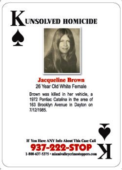 Jacqueline Brown was killed in her vehicle, a 1972 Pontiac Catalina in the area of 163 Brooklyn Avenue in Dayton, OH on 07/12/1985. If you have any information about this case, please contact Miami Valley Crime Stoppers at 937-222-STOP, 1-800-637-5375 or miamivalleycrimestoppers.com.