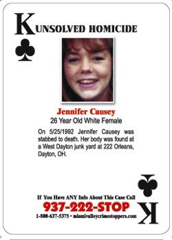 On 05/25/1992, Jennifer Causey was stabbed to death. Her body was found at a west Dayton junk yard at 222 Orleans, Dayton, OH. If you have any information about this case, please contact Miami Valley Crime Stoppers at 937-222-STOP, 1-800-637-5375 or miamivalleycrimestoppers.com.