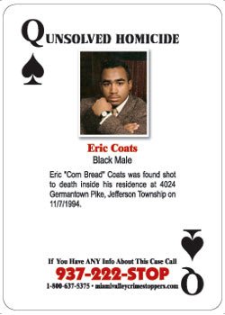 Eric "Corn Bread" Coats was found shot to death inside his residence at 4024 Germantown Pike, Jefferson Township on 11/07/1994. If you have any information about this case, please contact Miami Valley Crime Stoppers at 937-222-STOP, 1-800-637-5375 or miamivalleycrimestoppers.com.