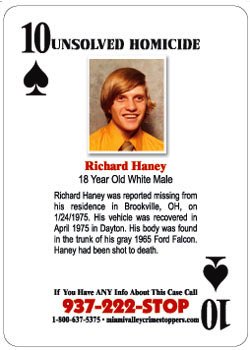 Richard Haney was reported missing from his residence in Brookville, OH on 01/24/1975. His vehicle was recovered in April 1975 in Dayton. His body was found in the trunk of his gray 1965 Ford Falcon. Haney had been shot to death. If you have any information about this case, please contact Miami Valley Crime Stoppers at 937-222-STOP, 1-800-637-5375 or miamivalleycrimestoppers.com.