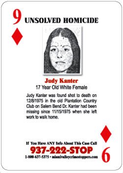 Judy Kanter was found shot to death on 12/08/1975 in the old Plantation Country Club on Salem Bend Drive. Kanter had been missing since 11/15/1975 when she left work to walk home. If you have any information about this case, please contact Miami Valley Crime Stoppers at 937-222-STOP, 1-800-637-5375 or miamivalleycrimestoppers.com.