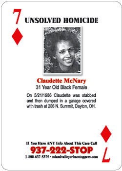 On 05/21/1986, Claudette was stabbed and then dumped in a garage covered with trash at 206 North Summit, Dayton, OH. If you have any information about this case, please contact Miami Valley Crime Stoppers at 937-222-STOP, 1-800-637-5375 or miamivalleycrimestoppers.com.