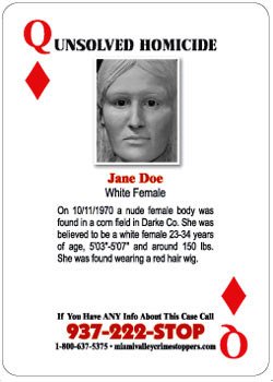 On 10/11/1970, the body of a female was found in a corn field in Darke County, OH. She was believed to be a white female 23-34 years of age, 5'03"-5'07" and around 150lbs. She was found wearing a red hair wig. If you have any information about this case, please contact Miami Valley Crime Stoppers at 937-222-STOP, 1-800-637-5375 or miamivalleycrimestoppers.com. This woman was later identified as Jeanne Marie Melville from Green Bay, Wisconsin.