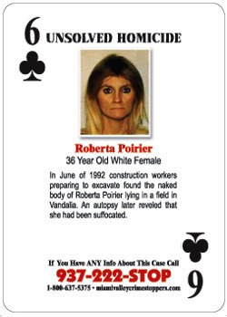 In June of 1992 construction workers preparing to excavate found the naked body of Roberta Poirier lying in a field in Vandalia. An autopsy later reveled that she had been suffocated. If you have any information about this case, please contact Miami Valley Crime Stoppers at 937-222-STOP, 1-800-637-5375 or miamivalleycrimestoppers.com.