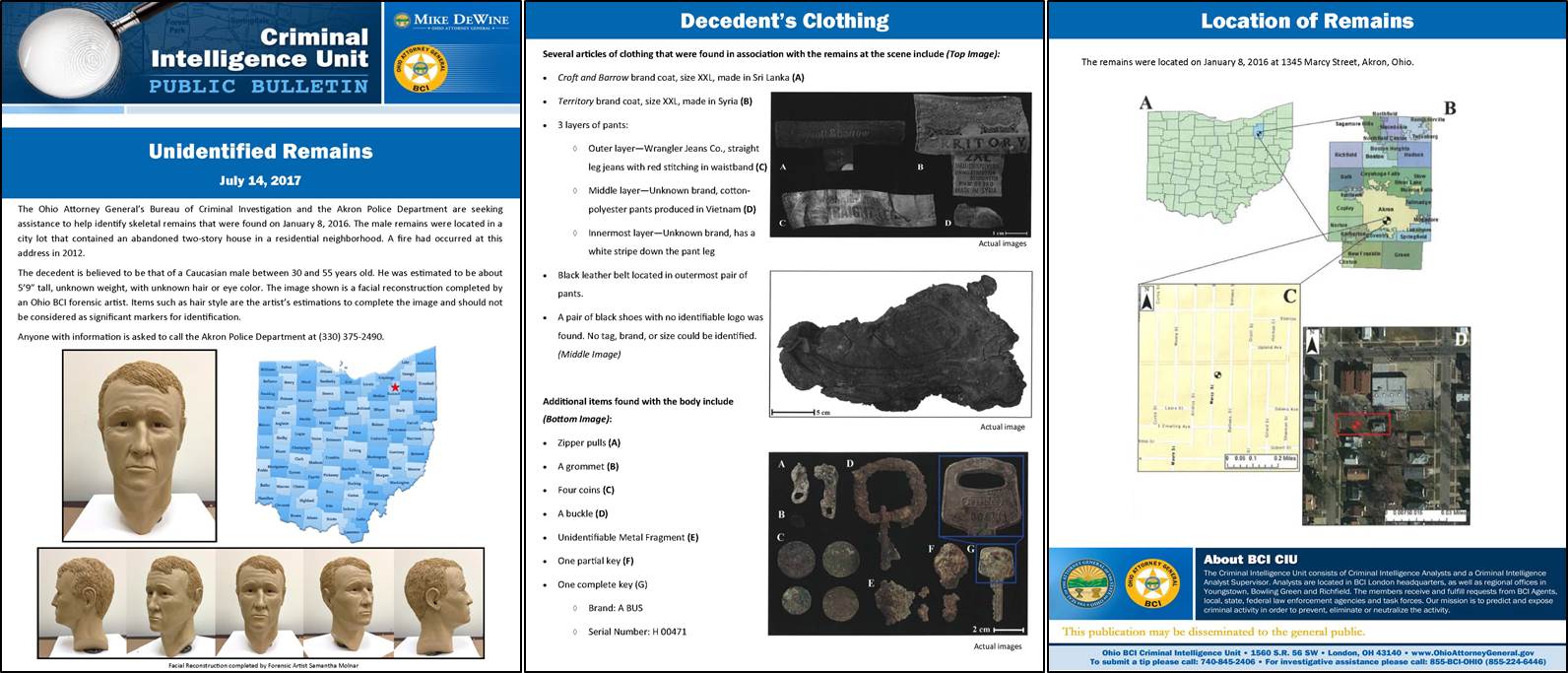 On January 8, 2016, male skeletal remains were located in a city lot that contained an abandoned two-story house in a residential neighborhood. A fire had occurred at this address in 2012, 1345 Marcy Street, Akron, Ohio. The decedent is believed to be that of a Caucasian male between 30 and 55 years old. He was estimated to be about 5’9” tall, unknown weight, with unknown hair or eye color. Several articles of clothing that were found in association with the remains at the scene include: Croft and Barrow brand coat, size XXL, made in Sri Lanka, Territory brand coat, size XXL, made in Syria, 3 layers of pants: outer layer was Wrangler Jeans Co., straight leg jeans with red stitching in waistband, middle layer was an unknown brand, cotton polyester pants produced in Vietnam, innermost layer was an unknown brand, has a white stripe down the pant, leg black leather belt located in outermost pair of pants, A pair of black shoes with no identifiable logo was found. No tag, brand, or size could be identified. Additional items found with the body include: zipper pulls, a grommet, four coins, a buckle, unidentifiable metal fragment, one partial key, and one complete key, brand “A BUS” with serial number H 00471. The image shown is a facial reconstruction completed by an Ohio BCI forensic artist. Items such as hair style are the artist’s estimations to complete the image and should not be considered as significant markers for identification. Anyone with information is asked to call the Akron Police Department at (330) 375-2490. DNA is available for comparison.