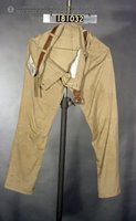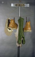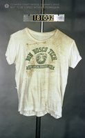 white t-shirt "DON BOSCO TECH PHYS. ED" green in color, a plaid flannel shirt (blue, brown, tan, and white), tan pants, a brown vinyl jacket, a gray hooded sweatshirt, two pairs of socks, green underneath brown, a brown belt, and orange ankle high boots, size 8 1/2. He also had a brown shaving kit with him.