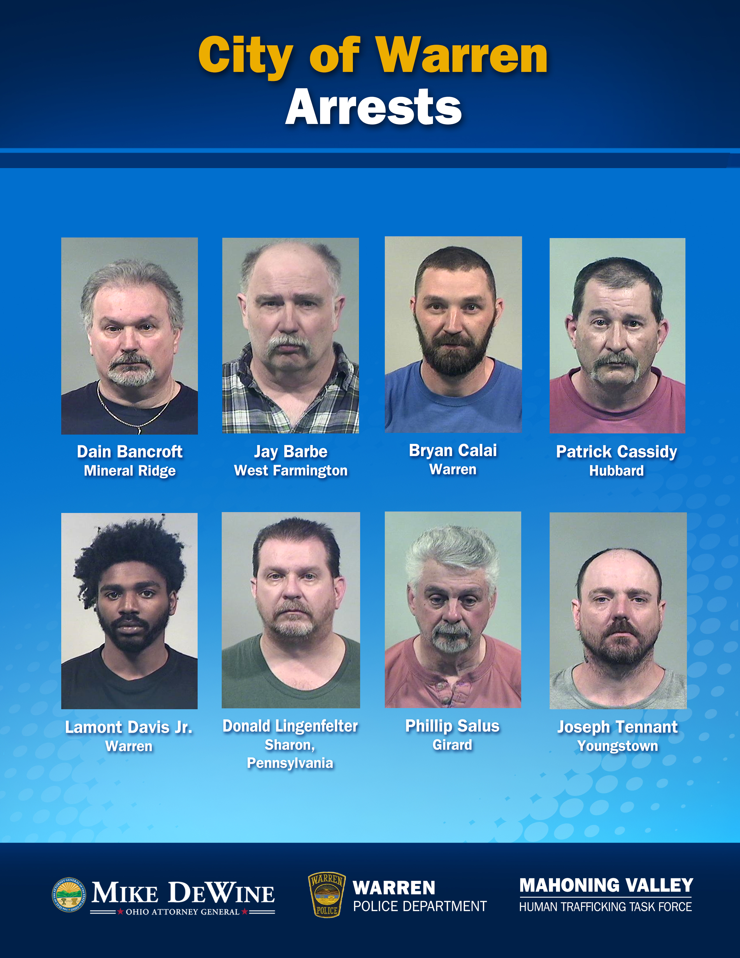 (WARREN, Ohio)—Ohio Attorney General Mike DeWine and Warren Police Chief Eric Merkel today announced that an undercover operation aimed at reducing demand for sex trafficking has led to the arrests of eight men, including one suspect who investigators believe was allegedly attempting to recruit an undercover officer into the sex trade.