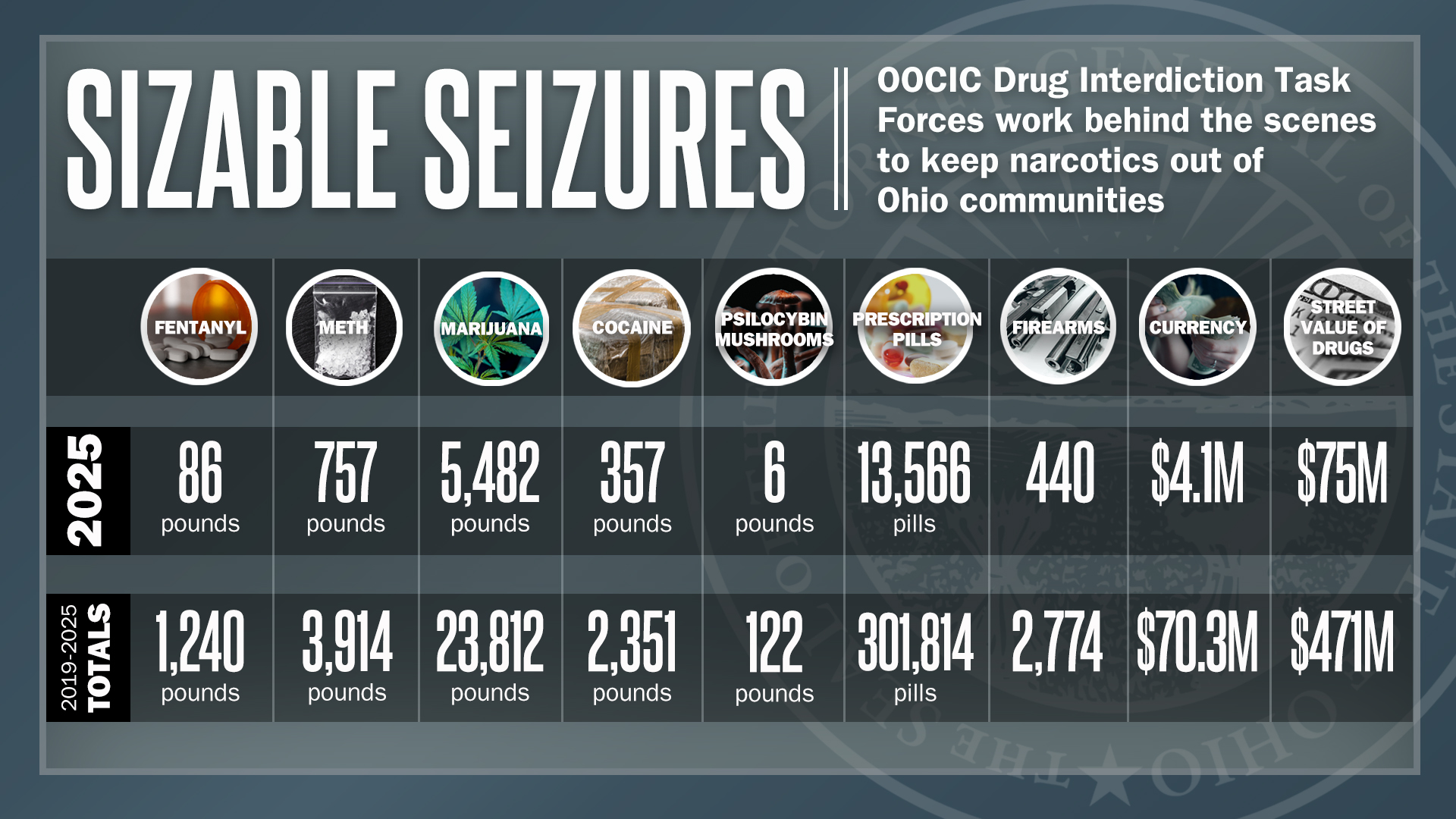 (COLUMBUS, Ohio) — Law enforcement task forces established under the Ohio Organized Crime Investigations Commission (OOCIC) thwarted drug traffickers in 2025 by confiscating more than $75 million worth of illegal drugs, 440 firearms and $4.1 million in cash, Ohio Attorney General Dave Yost announced today.