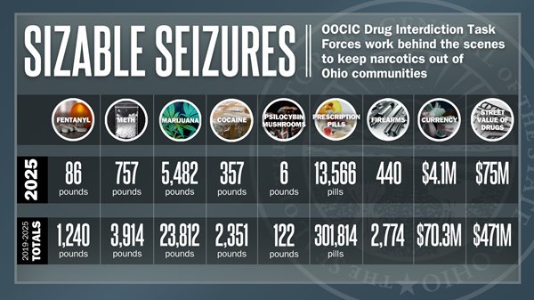 “In Ohio, we direct significant resources toward intercepting illegal drugs before traffickers can take advantage of those suffering from substance use disorders,” said Governor Mike DeWine. “I applaud OOCIC's major drug interdiction task forces on another successful year of promoting recovery by keeping a significant amount of drugs off the streets and holding accountable the individuals who wrongly thought they could get away with trafficking drugs in Ohio.”