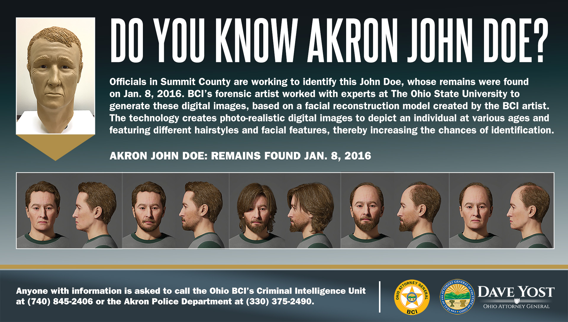 (AKRON, Ohio) — Armed with a cutting-edge facial reconstruction of a John Doe whose remains were found in Akron eight years ago, Ohio Attorney General Dave Yost and Summit County Medical Examiner Dr. Lisa Kohler today renewed a public call for help in identifying the man.