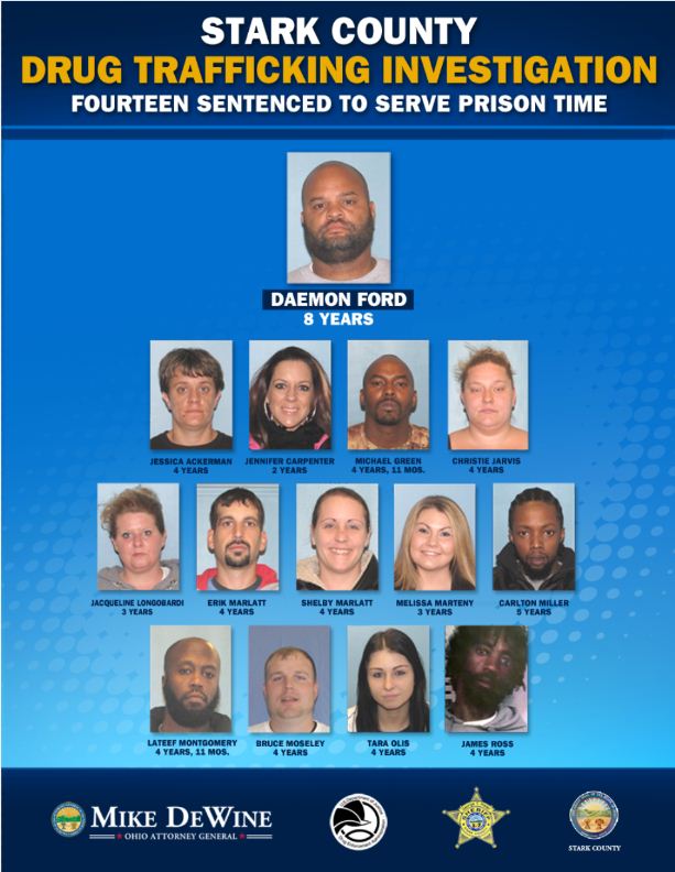 (CANTON, Ohio) -- Ohio Attorney General Mike DeWine, Stark County Sheriff George Maier, Stark County Prosecutor John Ferrero, and the Drug Enforcement Administration (DEA) announced today that 14 individuals have been sentenced to serve time in prison for their participation in a drug trafficking organization that operated in and around Stark County.