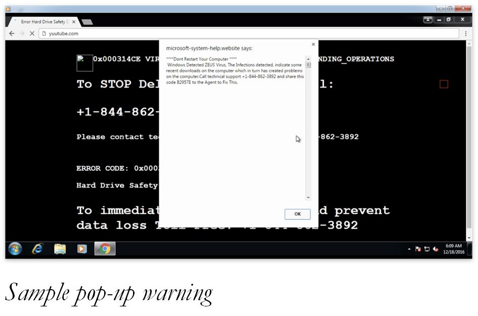 The investigation into Repair All PC found that the scheme generally began when consumers were browsing online and received a pop-up security warning on their computer. The warning indicated that the computer was infected with a virus (or was otherwise compromised) and instructed the consumers to call a toll-free number.