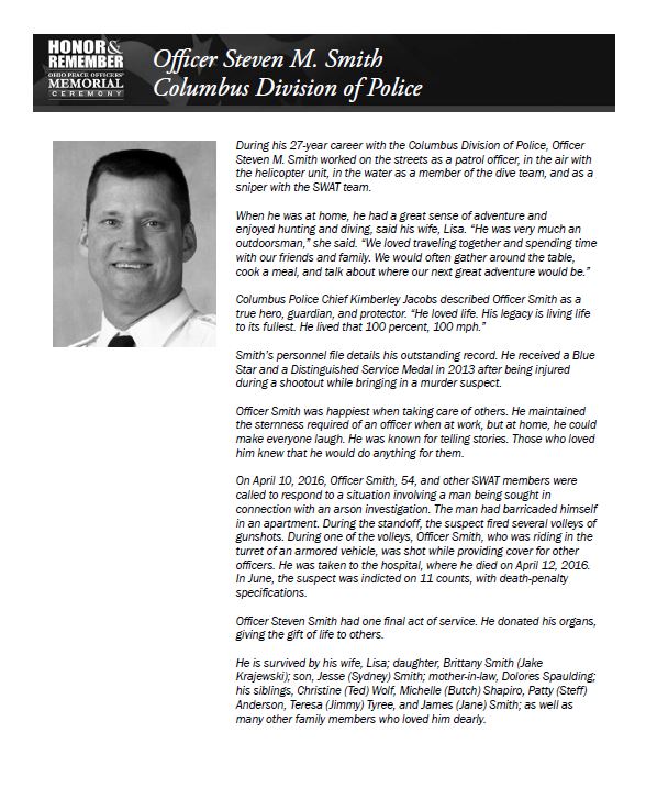 On April 10, 2016, Officer Smith, 54, was shot while providing cover for other officers during a standoff situation. He was taken to the hospital, where he died on April 12, 2016. During his 27-year career with the Columbus Division of Police, Officer Smith worked on the streets as a patrol officer, in the air with the helicopter unit, in the water as a member of the dive team, and as a sniper with the SWAT team. Smith's personnel file details his outstanding record. He received a Blue Star and a Distinguished Service Medal in 2013 after being injured during a shootout while bringing in a murder suspect. Click here to read more about Officer Smith.
