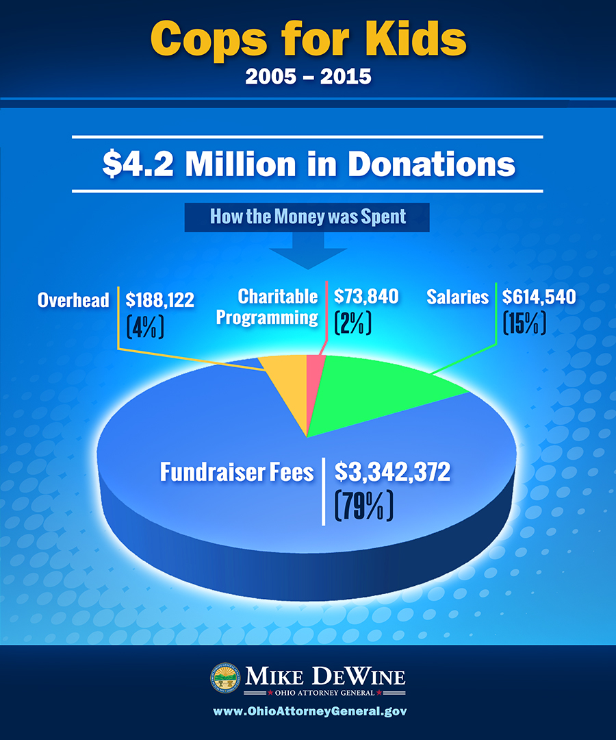 According to the lawsuit, Cops for Kids Inc. (also known as Ohio Cops for Kids) collected over $4.2 million in donations from Ohio residents between 2005 and 2015 but spent less than two percent of it on charitable programming, instead paying the vast majority — over $3.34 million — to its for-profit solicitor, Telcom Enterprises, and an additional $802,662 on salaries and overhead.