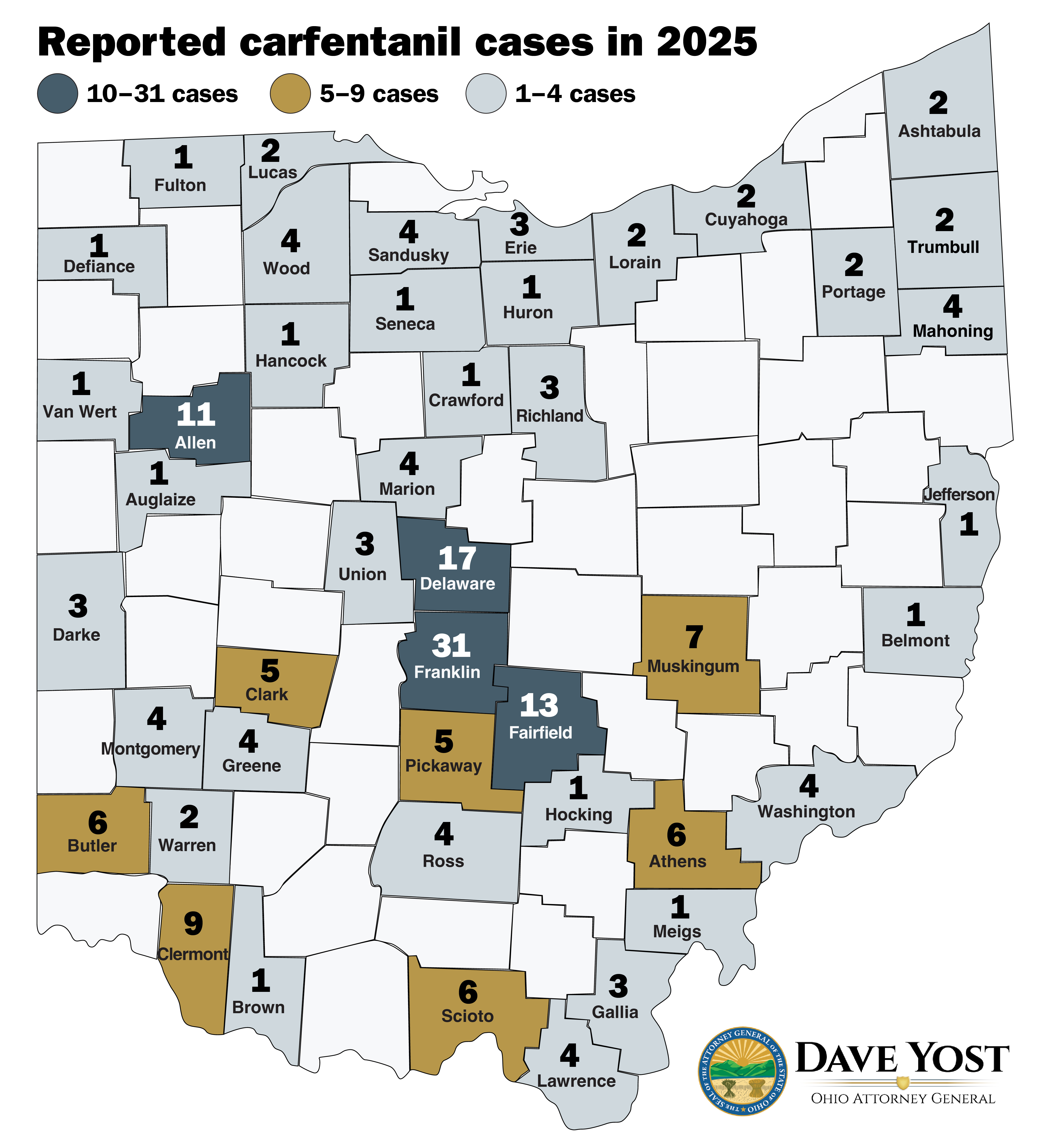 The 199 items found to contain carfentanil so far this year encompass samples from 46 Ohio counties. The drug’s highest prevalence has been in central and northwestern Ohio, with a more recent increase noted in southern Ohio counties.