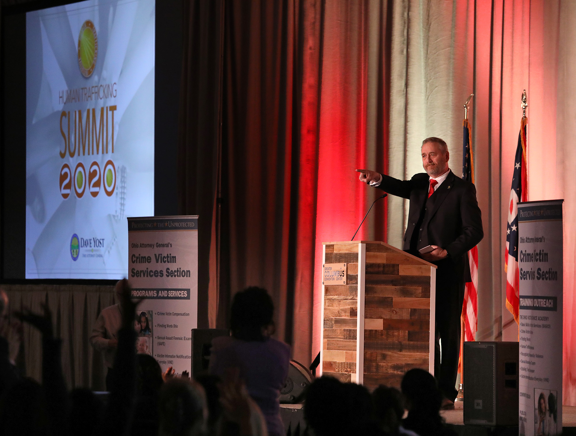 Attorney General Dave Yost speaks at his inaugural Human Trafficking Summit, held Jan. 9, 2020, to identify gaps in Ohio's human trafficking fight and share success stories, lessons learned and best practices. About 600 people attended.